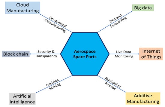 Industry 4.0 gives the vision of a new industrialization concept that exploits newer technologies to fabricate spare parts for building smart factories. Smart factories are self-adaptive, making them the heart of Industry 4.0 [129]. A smart factory integrates new technologies like blockchain to improve the overall quality, performance, and transparency of the manufacturing processes. Blockchain helps to monitor printed parts with the secured exchange of data among the stakeholders, improving the process and reducing the logistic costs with the help of a flexible supply chain [130,131]. From a supply chain perspective, smart factories are self-sufficient facilities that source raw materials from local suppliers. Sustainable approaches to building smart factories need to be ensured by 4Vs volume, variety, velocity, and veracity [132]. Yet, more research is needed regarding how to adopt a smart system with the implementation of I4.0 technologies to manage spare parts production in the aerospace industry.