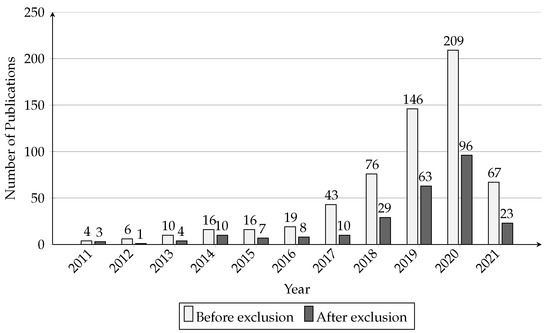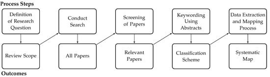 - Petersen, K.; Feldt, R.; Mujtaba, S.; Mattsson, M. Systematic Mapping Studies in Software Engineering. In Proceedings of the 12th International Conference on Evaluation and Assessment in Software Engineering (EASE’08), Karlskrona, Sweden, 15–16 June 2017; BCS Learning and Development Ltd.: Karlskrona, Sweden, 2008; pp. 68–77. [Google Scholar]