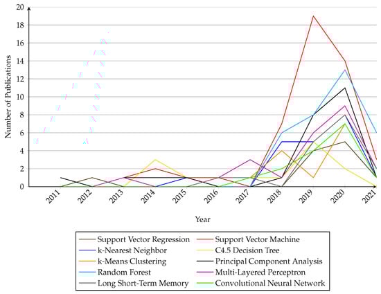 - Are there algorithms that are currently gaining momentum?Rationale: In order to identify and fill gaps of machine learning applied in the manufacturing sector, this question aims to determine potential algorithms for implementation within the research domain by examining their frequency of use in current research.