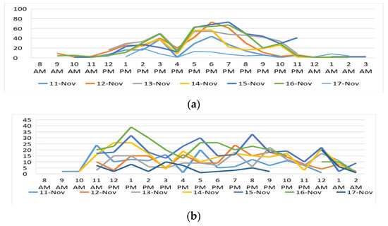 Typical external truck (a) departures and (b) arrivals patterns in Alexandria container terminal in November 2017 [6].