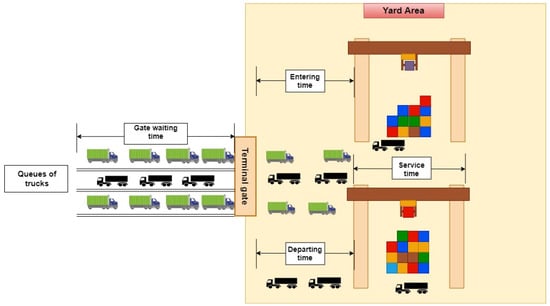 The importance of external truck appointment scheduling is concluded from the literature, the surrounded community, and the environmental perspectives. As mentioned previously, many literature review studies discussed how crucial is to schedule the appointments of external trucks in container terminals for all stakeholders involved in these networks such as ref. [8], which assured that there are still some gaps in this research area. Additionally, many studies have emerged in literature focusing on reducing the harmful emissions on one hand, and scheduling the appointment of external trucks on the other hand as in the work of [10,11]. The community perspectives put pressure on addressing the external trucks appointment scheduling, especially in the residential areas next to container terminals’ landside areas because of the congestion of trucks during rush hours [12]. The previously mentioned reasons motivated the authors to focus on the external truck appointment scheduling in container terminals.
