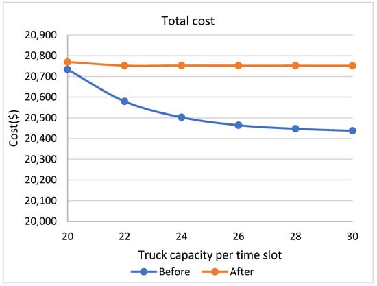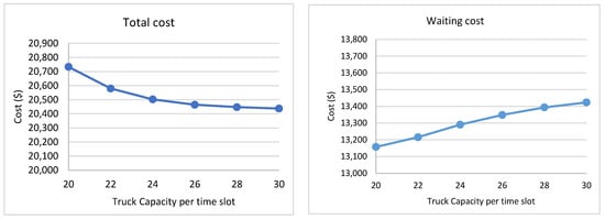 To further investigate the results, a sensitivity analysis was performed to verify the effect of the number of trucks available at each time slot on the three cost parameters (i.e., container delivery cost, demurrage cost, and waiting time cost). The sensitivity analysis experiment is elaborated on in the next subsection.