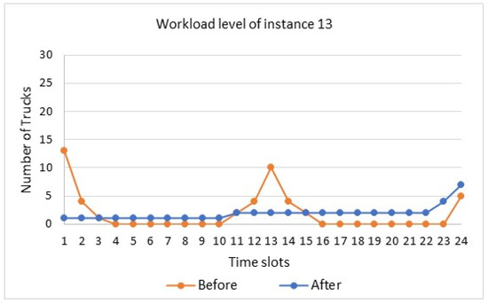 Figure 7 represents the variation that occurred in the terminal workload curve after redistributing the trucks upon the time slots. What is striking in this figure is the stability of the workload after applying the proposed constraint. The graph shows a significant difference between the two workload patterns. A considerable number of trucks are assigned to deliver containers to the terminal in time slots 1 and 13. In contrast, the terminal will not receive containers in other time slots (e.g., 4–9) causing a long idle time of terminal resources and, consequently, a low utilization level.