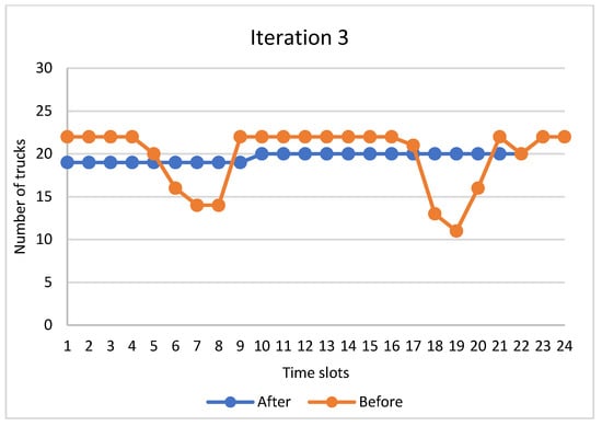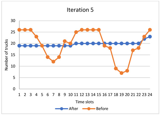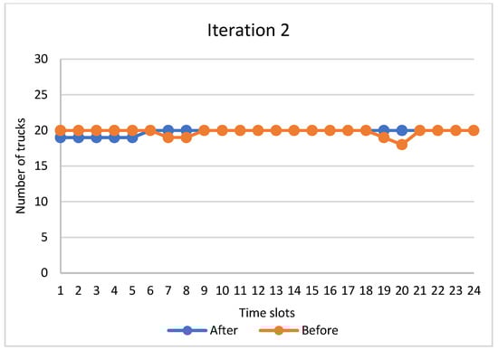 On the other hand, Figure 9 shows a slight change in the workload pattern of iteration two after adding the new constraint. The rest of the iterations clarify the effect of the constraint on workload pattern inside the terminal in each scenario presented in Table 8. It could be noticed that the level of workload during the working hours for all iterations is almost steady. The minimum workload level is 19 trucks for each time slot. Although the workload level slightly increased in some time slots among all iterations, no peaks or valleys are observed in the workload patterns, which results in a stable workload, and high utilization of the resources.