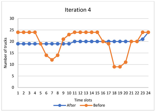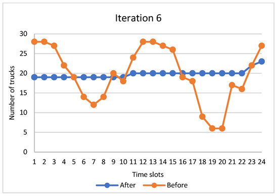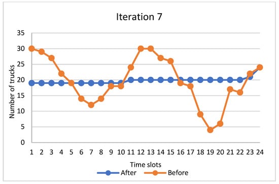 The same procedure was performed on instance 8, which incorporates the highest workload. The previously mentioned scenarios were tested with the leveling constraints (refer to Table 8). Figure 8, Figure 9, Figure 10, Figure 11, Figure 12 and Figure 13 show the workload of the container terminal before and after applying the leveling constraint. Before leveling, it is noticeable that in Figure 8, the workload curve almost has no peaks (constant workload level) in all-time slots, which confers higher utilization of all the terminal resources. However, this scenario results in the highest total cost among all other scenarios due to the limited number of trucks compared with the required tasks per each time slot. While in the case of iteration 7, the workload level is not stable because there are plenty of trucks that can execute the required tasks during each time slot.
