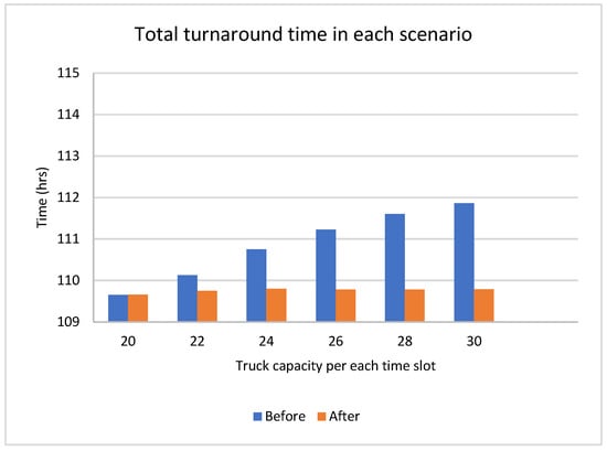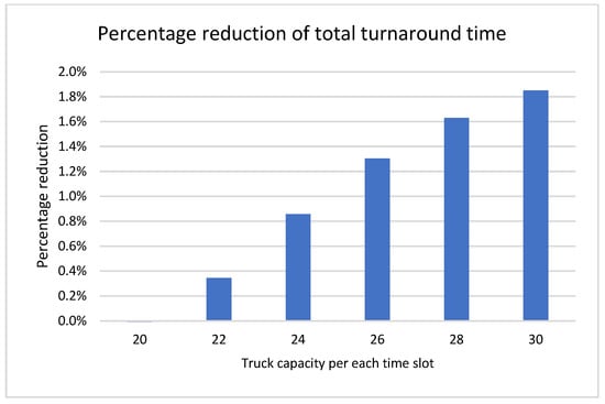 Leveling the workload pattern of the terminal has several effects on all stakeholders. From the terminal manager’s perspective, it guarantees that all resources are exploited optimally. Moreover, it preserves the truck densities inside the terminal to avoid congestion. Likewise, it is beneficial for trucking companies because it reduces the total TTT. Figure 14 shows the effect of the proposed constraint on the total TTT in each scenario. The higher the available trucks per time slot, the more the reduction percentage of total TTT, which is revealed in Figure 15. Hence, leveling the workload is very useful for decreasing the TTT, especially with a high number of available trucks.