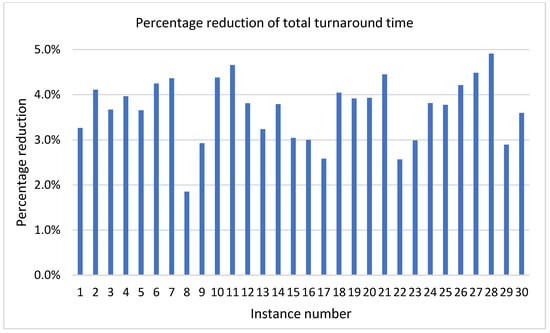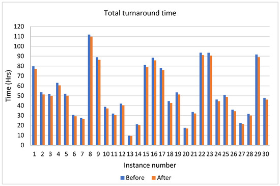 In this section, the total TTT is measured in all instances before and after balancing the workload to verify the performance of our model. From Figure 19, It can be seen that the total TTT decreased in all cases. Figure 20 is constructed to feel the significant effect of the proposed model. It is noticeable that the maximum reduction of the total TTT has resulted in instance 28, reaching 4.9% compared with before leveling. While the minimum percentage of reduction is 1.9%, which is recorded in instance 8.