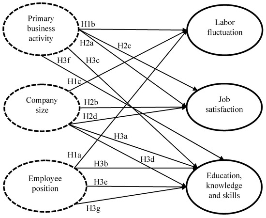 On the basis of a systematic review of the literature, information from industry and previous experience and previous research of the authors [43], a construct was defined to measure job satisfaction and examine the causes of expressed employee turnover. The basic dimensions identified in this paper are: labor fluctuation; job satisfaction; education, knowledge and skills; primary business activity; company size and employee position (Figure 1).