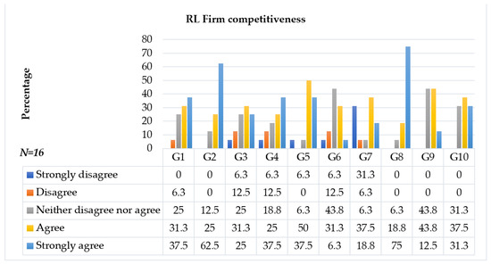 RL firms’ competitiveness based on retailers. G1 = Our FMCG retail firm is more profitable compared to our competitors; G2 = Our FMCG retail firm provides products of higher quality as compared to our competitors; G3 = Our FMCG retail firm offers products of lower cost as compared to our competitors; G4 = Recycling waste has enabled our FMCG retail firm to offer products of better value than that of our competitors; G5 = Dumping waste in a legally controlled and safe ground has helped us to protect our image; G6 = Reusing our expired products that are safe for use has made us gain a low-cost advantage over our competitors; G7 = Changing the packaging of returned damaged products and selling them to second-hand markets has helped us improve our product image; G8 = Having a product returns policy has helped us to improve our image in the market; G9 = Having a separate unit that deals with the returned products has helped us improve our service to our customers; G10 = Having dedicated staff to handle customers complaints has helped us improve customer satisfaction with our service.