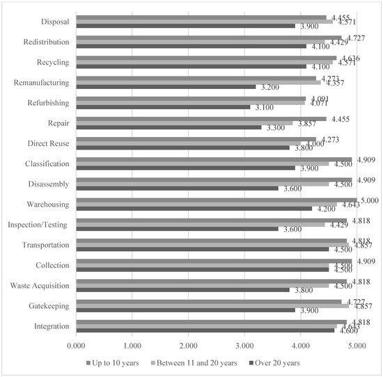 Analyzing the averages based on the opinion of specialists who have between eleven and twenty years of experience, the degree of certainty changes concerning the more experienced responding professionals. Of the sixteen activities analyzed, ten had an average equal to or greater than 4.5. In other words, this group of experts is convinced that the Integration, Gatekeeping, Waste Acquisition, Collection, Transport, Warehousing, Disassembly, Classification, Recycling, and Disposal activities are part of the RL processes.
