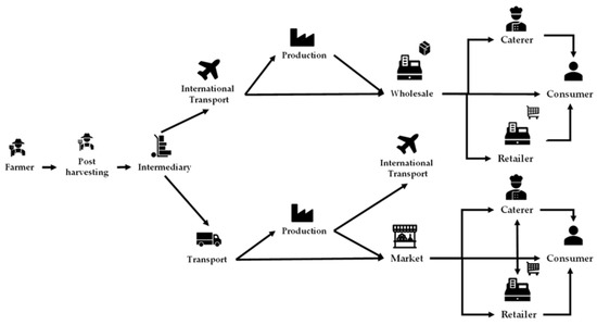 In international logistics chains in particular, import and export companies are the next actors to handle food. They are usually responsible for the control of cross-border transport, even if they are operationally carried out by logistics service providers. If the consumption or production takes place in the country of origin, the transport carried out by local service providers is the next step in the chain. For products sent for further processing, production follows regardless of the current location. Losses that occur directly through production processes are not the direct focus of FLM in logistics, but processes that are part of production logistics are included. Further transport, whether local or international, follows production to access the consumer markets [25,27,28].