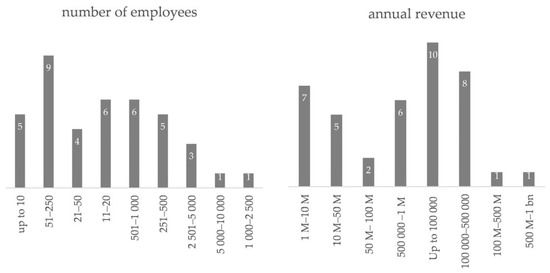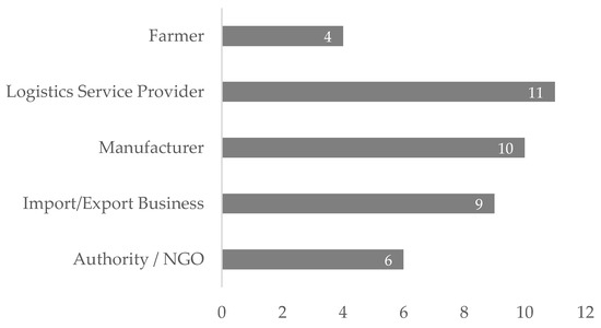 The largest group of participants was logistics service providers, with 11 participants, followed by manufacturers with 10 participants, import–export businesses with 9 participants and authorities or NGOs with 6 participants and 4 participants who assigned themselves to the group of farmers. There were no representatives from the group of retailers within the participating organisations. Organisation size was measured by the number of employees and annual revenue. Both indicators are shown in Figure 5.