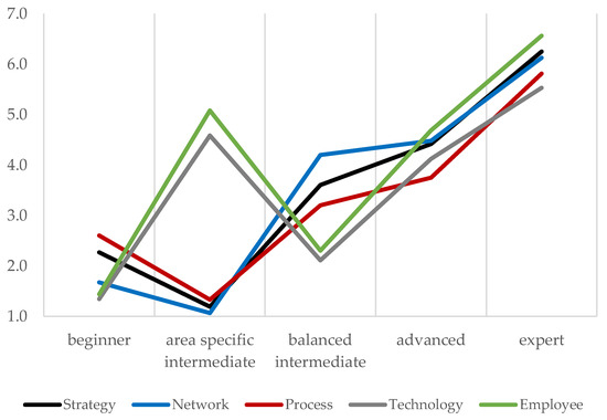 The organisations with this profile were, as previously presented, on a higher level in the dimension’s strategy and network than in the other three dimensions. However, a more detailed view of the answers found that they had a poor overview of the losses occurring in their organisations and could not quantify them. Similarly, the answers in the dimension of employees showed a lack of provision of relevant information to employees, and those in the dimension of technology showed a lack of use of appropriate technologies to create transparency. Combined with these answers, it can be concluded that these organisations should focus on the field of transparency. As already deduced from the beginner profile, transparency is a prerequisite for structured engagement with FLM. The positioning of organisations with this profile to date reflects that certain successes can be achieved, even without this basis, but this could also be why these organisations showed greater deficits in dealing with FLM in certain sub-areas. In combination with the low use of appropriate technologies, these organisations should implement measures that lead to better information provision.