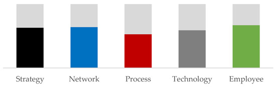 Figure 12 shows the specification of the dimensions for this profile. As in the case of the balanced intermediate profile, the key figures were heterogeneously distributed. The highly different characteristics of the number of suppliers and customers here, coupled with the above-average characteristics of the network dimension, showed that the organisations could position themselves successfully in this area regarding FLM, regardless of the number of network partners. Additionally, the weakest dimension (process) was the only one below average for this profile group. These organisations were thus characterised by a clear weakness in the alignment of their own processes with FLM, although they generally showed an understanding of how to consider FLM. In this context, it is notable that the organisations within the process consideration predominantly lacked a utilisation strategy for surpluses and simply disposed of them. The majority of these organisations also lacked a storage strategy, which was an obvious weakness within the processes, considering that the shelf life of foodstuffs fundamentally influences losses.