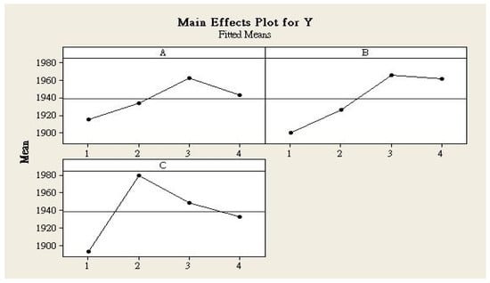 and were set at the range of [0.4, 1.9] with an increment of 0.5, while W was suggested as [0.8, 1.4] with an increment of 0.2. Figure 6 shows the main effects plot from the results of DOE. A, B, and C are each symbolized as , , and W. Y is the response of the total cost, including carbon pollution cost.