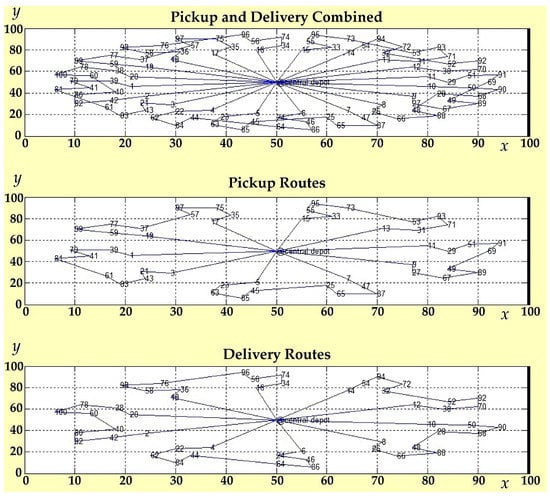 The authors of [] presented a developed PSO algorithm with an indirect real-number-based representation of (n + 2m) to map the priority lists of an n-customer and m-vehicle. The priority of the customer is assigned based on the value of a given dimension of particles. Next, the concept of the vehicle orientation point is introduced to indirectly cluster the customers and then prioritize each further. At the same time, the same authors of [] introduced another representation method of 3m dimensional particles and replaced the concept of the vehicle orientation point with the vehicle coverage radius to construct the routes. The result showed the 3m mapping method outperformed the (n + 2m) one in solving the capacitated VRP instances.