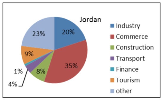 Jordan is an upper-middle income country that depends almost completely on SMEs as the economy driver. For instance, in 2021, SMEs accounted for 95% of the business market in Jordan []. Moreover, SMEs represent roughly 95% of all registered companies, contribute 50 percent or more to GDP, and provide employment to an estimated 60 percent of the Jordanian workforce []. These are significant indicators of the importance of SMEs to the Jordanian economy and how crucial their involvement in any economic development plan is. In Europe, an SME is defined as a firm that has fewer than 250 employees with a total turnover that does not exceed EUR 50 million [], while in Jordan the numbers are much smaller, where SMEs are defined as firms employing fewer than 100 employees with a total turnover that does not exceed JOD 3 million (JOD 1 JD equals USD 1.41) []. According to the Ministry of Industry (Trade and Supply Act No. 10 of 2005), a small enterprise in Jordan is defined as any individual company or enterprise with the primary purpose of industry, where its capital is less than JOD 30,000, and it has fewer than 10 employees registered in the Social Security Administration. Micro businesses comprise 89% of the total enterprises in Jordan, while 9% are small enterprises and the remaining 2% are medium and large enterprises []. Figure 1 depicts the sectoral distribution of SMEs in Jordan. It can be seen in Figure 1 that the largest share of SMEs in Jordan is in the commercial establishment category (35%), followed by the service provider category (23%), whereas a significant share is in industrial production (20%), and the rest is dedicated to tourism, construction, transport, and the finance sectors (9%, 8%, 4%, and 1%, respectively) [].