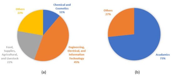 The current research surveys the awareness and application of Industry 4.0 concepts and technologies in Jordanian SMEs. The main research question in this survey is: What is the situation of Jordanian SMEs concerning Industry 4.0 readiness, maturity, drivers, and barriers? To answer this question, an online questionnaire was created. Questionnaires are the typical quantitative technique to adopt in such exploration studies [,,,]. The study explores the views of two different categories; the first one is the SME respondents, while the other category represents local experts in Industry 4.0, including industry consultants, legislation bodies, and academics. SMEs’ responses reflect the real situation of Industry 4.0 on the ground, which is, in general, profit-oriented and focused on short-term deliverables. Conversely, the long-term vision, theoretical background, and enlightenments, revealed in experts’ opinions, could be utilized in strategizing and planning schema for Industry 4.0 implementation at a country scale. Data collection was carried out by completing the online questionnaire. Overall, 90 companies and 35 Industry 4.0 experts were addressed and 24 of them fully answered the entire questionnaire, which made for a 19.2% response rate. These modest values are justified for such kinds of surveys due to the following practical and theoretical reasons; practically, purpose sampling technique was used as a pilot study to obtain representative responses. The questionnaire was only sent to respondents for whom Industry 4.0 concepts are relevant. Otherwise, the responses would have underestimated the status of Industry 4.0 due to misunderstanding and lack of knowledge. This technique is also used in other country-based initiatives to evaluate Industry 4.0 status [,]. Theoretically, the sample size was within the acceptable range for pilot studies mentioned in the literature. For instance, Saunders and Tosey [] recommend a minimum of 10 respondents, Aaker and Keppel [] recommend 15 to 25 respondents, Taylor et al. [] recommend 15 to 30 respondents, Johanson and Brooks [] recommend that 30 respondents’ sample is a reasonable count for a pilot study. Respondents who answered the questions consisted mainly of practitioners from industry (37.5%) and experts (62.5%). According to Amman Chamber of Industry (ACI), the industrial companies in Jordan are categorized under one of the following ten categories: chemical and cosmetics; engineering, electrical, and IT; leather and garments; mining; printing, packaging, paper, cartoon, and stationeries; therapeutic and pharmaceutical; construction; food, supplies, agricultural, and livestock; wooden and furniture; and plastic and rubber []. In this study, the ACI classification is considered to group SMEs. Figure 2 depicts the breakdown of respondents by categories. As can be seen in Figure 2, most of the SME respondents (45%) were from engineering, electrical, and IT industries. The second largest category was from food, supplies, agricultural, and livestock industries (22%), followed by chemicals and cosmetics (11%). The category “others” included areas such as transport, tourism, and finance sectors. Industry 4.0 experts’ sample consisted mainly of academics (73%). The “other” category includes Industry 4.0 consultants, legislation bodies, etc.