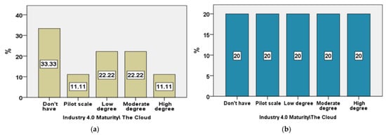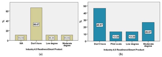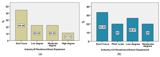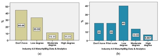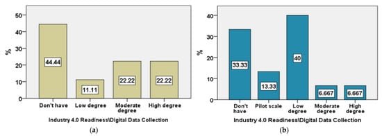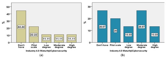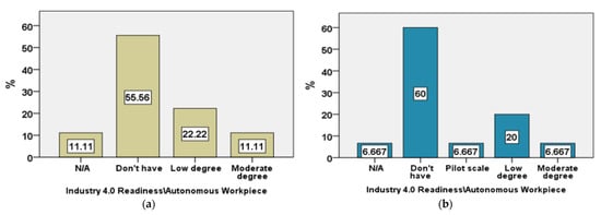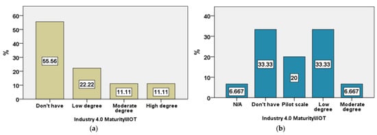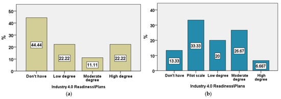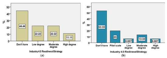 To make it easier for the reader to analyze the data in the following figures, Figure 3 is described in detail, while in the other figures, only the major findings are summarized. As depicted in Figure 3, around 44% of the surveyed SMEs do not have a specific strategy for Industry 4.0 implementation, while around 22% of them have a strategy at low or medium levels. Only around 11% of the investigated companies have an Industry 4.0 strategy with a high level. Industry 4.0 experts have a slightly different opinion regarding this item; around 53% of Industry 4.0 experts, in the surveyed sample, see that SMEs in Jordan do not have a specific strategy for Industry 4.0, while 20% see that the SME sector has Industry 4.0 strategy initiatives in the pilot phase. The same percentage of the experts (around 6.7%) see that the companies have a strategy to apply Industry 4.0 to low or high levels. The rest of the investigated sample (around 13.3%) see that Industry 4.0 strategy is applied to a moderate level. As mentioned earlier in this section, the results obtained for this aspect coincide with the literature, stating that SMEs do not focus on long-term strategies and they are operations-oriented [,]. These findings highlight the exigency for country-scale initiatives to strategize Industry 4.0, incorporating government agencies, industry chambers, and experts.