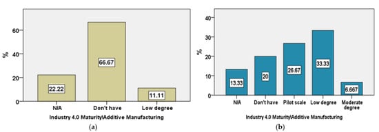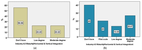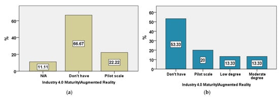 The first aspect of Industry 4.0 practice and maturity is big data and analytics. As can be seen in Figure 9, the highest percentage of the SMEs (around 44%) do not use big data and analytics, while 40% of Industry 4.0 experts think that this technology is applied in Jordan to a low degree. The reason for this difference could be the holistic view of Industry 4.0 experts, which is missing within narrow industrial horizons. Experts’ opinion is based on their solid academic background in addition to their broad experience in Industry 4.0 implications. An interesting finding about the use of autonomous robots in production processes can be noticed in Figure 10. In total, 80% of the experts are divided into two equal groups, the first group (40% of the sample) think that SMEs in Jordan are not using autonomous robots, while the other group supports the idea that this technology is used in Jordan with low levels. Practically, most of the industry sample (around 78%) stated that they do not utilize autonomous robots. As stated earlier in this section, industry responses, in this aspect, are more realistic and objective than experts’ opinions, which could be biased toward technology due to their academic background. The same pattern is noticed for the Industry 4.0 maturity\simulation aspect. Around 27% of the experts believe that this technology is not used in the Jordanian industry. The same percentage thinks that simulation is employed to a moderate level, while most SMEs (around 56%) depicted that they do not employ simulation in their industrial processes (Figure 11). For the horizontal and vertical integration measure, around 56% of the sample admitted that they are not users of this technology. At the same time, 40% of the experts expected this result (Figure 12). These results agree with the results of a study regarding the use of supply chain management information systems within the Jordanian manufacturing sector []. As can be seen in Figure 13, Figure 14, Figure 15 and Figure 17, the pattern is the same for IIoT, cybersecurity, the cloud, and augmented reality technologies; the highest percentage of SMEs stated that they do not have this technology (around 56%, 44%, 33%, and 67%, respectively) which coincides with the statements given by the highest percentage of Industry 4.0 experts (around 33%, 27%, 20%, and 54%, respectively). For additive manufacturing technology, although 57% of SMEs stated that they do not use this aspect, the highest percentage of the experts (around 33%) agreed that additive manufacturing is utilized to a low degree in Jordan (Figure 16). This is because additive manufacturing does not require high investments and could be feasibly implemented in Jordanian SMEs, particularly in sectors such as engineering and plastic and rubber.