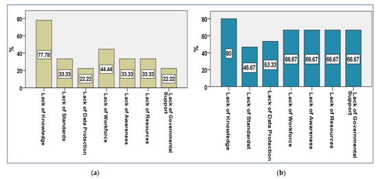 Response to Industry 4.0 Barriers multi-response question from two categories: (a) SME respondents; (b) Industry 4.0 experts.