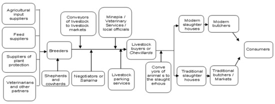 The meat supply chain integrates multiple stakeholders, as illustrated in Figure 1. This supply chain comprises a diversity of actors involved in breeding, livestock trade, slaughter and the distribution of meat to consumers.