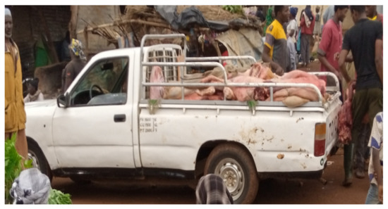 The slaughtering operations are supervised by the Chief Butcher, assisted by the Butcher’s Advisor and the Chief Butcher’s Helper. The butcher’s helpers or cowherds are specialized by activity and, as remuneration for each slaughtered animal, they take certain parts of the meat (Sargal), which they divide up and can then resell. The owners of the slaughtered animals (chevillards) pay a slaughter tax of XAF 1700 per animal. This tax is collected by the Minepia center chief, who is then responsible for distributing it to the various rightful owners. He is also responsible (along with veterinary agents) for antemortem checks of the animals and post-mortem checks of the carcasses. After stamping, the healthy carcasses are immediately transported to the markets and butcheries using makeshift means of transport (open private vehicles, pick-ups, tricycles or motorbikes) (Figure 3). Carcasses that are not fit for consumption are seized and, in principle, sent for incineration.