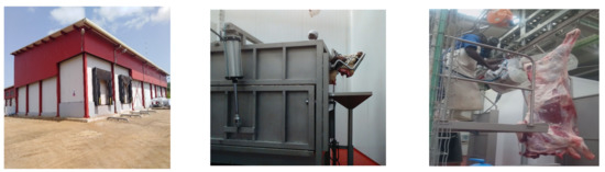 Adamaoua has an industrial slaughterhouse in the town of Ngaoundéré with an estimated slaughter capacity of 500 cattle per day, which is currently underutilized. Group or planned slaughtering is carried out, and slaughtering operations are carried out in accordance with slaughtering standards [24,25]. Emphasis is placed on strict compliance with hygiene rules. For example, animals undergo a water diet before slaughter. The Halal rite is observed when the animal is bled. The processing and cleaning of the carcasses and by-products are carried out in different circuits, respecting the principle of forward movement to avoid any contamination of the carcasses (Figure 4).