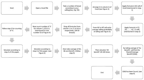 As we know, Table 1 shows the many types and sources of bread waste, whereas Table 2 details information regarding bread waste and points us in the direction of critical areas for intervention. Consequently, the authors collected data and used simulations to determine our findings. The data collection was designed to offer further knowledge on the researched phenomena and suggest ways of reducing bread losses. It concerns data from retailers and companies A, B, C, D, and E (in Table 3). It aims to collect retailer sales data per day per cycle and find the probabilities of selling bread on day 1 (D1) and day 2 (D2) … and day 6 (D6) in every cycle (in Appendix A). Retailers always need some inventory stock on hand to propagate the supply chain. Figure 2 demonstrates the simulation procedure used in this paper.