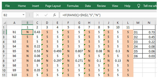 Step-2 There are various formulas used for the next columns: [=IF(B2=“S”,“S”,RAND())], [=IF(C2=“S”,“S”,IF(C2<$N$3,“S”,“N”))], [=IF(D2=“S”,“S”,RAND())], [=IF(E2=“S”,“S”,IF(E2<$N$4,“S”,“N”))], [=IF(F2=“S”,“S”,RAND())], [=IF(G2=“S”,“S”,IF(G2<$N$5,“S”,“N”))], [=IF(H2=“S”,“S”,RAND())], [=IF(I2=“S”,“S”,IF(I2<$N$6,“S”,“N”))], [=IF(J2=“S”,“S”,RAND())], [=IF(K2=“S”,“S”,IF(K2<$N$7,“S”,“N”))], used in column C, D, E, F, G, H, I, J, K, L (Figure 3) respectively.