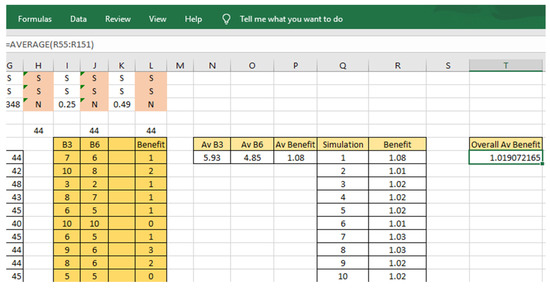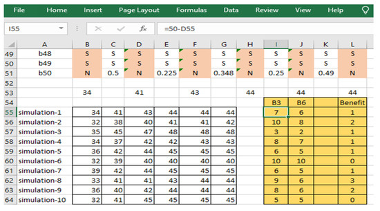 Step-1 In an Excel sheet, for example, 50 bread packets (b1, b2, b3, …, b50) are taken because the lot size that retailers prefer varies from 30 to 70 bread packets generally (someone can take any possible number of breads according to his per day selling, but he has to apply further steps). With the help of the average selling probability of bread selling per day per cycle (Appendix A), we apply some formulas as column B of the Excel sheet, [=IF(RAND()<$N$2,“S”,“N”)], shown in Figure 3 (displays only ten pieces of bread) where S represents that the bread has sold and N denotes that the bread has not sold. Column N in the Excel sheet represents the average selling probability of bread per day per cycle (Appendix A).