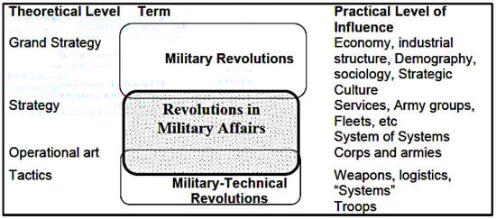| 1995 | Military Revolution (MR) | They profoundly alter the structure of war by profoundly transforming society, the state, and military organizations, modifying their capacity to create and project their military power [74]. |