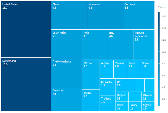 The United States contributed 16.7% of the studies that were conducted on the application of DTs in the agri-food supply chain. This was followed by Switzerland, which contributed 15.6% of the studies, and China, which contributed 6.1% of the publications (Figure 5).