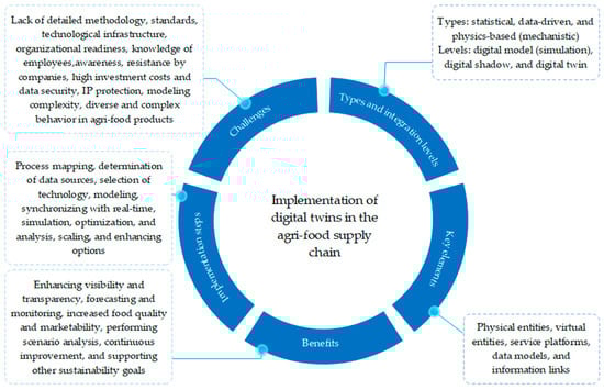 Currently, DT applications are more focused on sectors such as the manufacturing, construction, automotive, and aerospace industries [3]. Only a few studies have focused on DT applications in food and agriculture. In this case, there is an initial trend toward the implementation of DTs, and more clarity and insights are needed for the scientific community and industries interested in the implementation of this technology. To the best of our knowledge, despite being a hot topic that has caught the interest of many businesses and academics, DT implementation in the agri-food supply chain is still not well investigated, and no detailed study analyzing the current state of the art has been found. In particular, the benefits, types, levels of integration, key aspects, implementation processes, and challenges related to the adoption of DTs in the agri-food supply chain remain unclear. Therefore, this study aims to provide a first contribution to the topic by responding to the following research questions (RQs): how does the use of DT applications contribute to the agri-food supply chain? (RQ1); what are the key elements of implementing a DT? (RQ2); what types and levels of integration exist within the DT in the agri-food supply chain? (RQ3); what are the steps for implementation? (RQ4); and how challenging is it to adopt DTs in the agri-food supply chain? (RQ5).