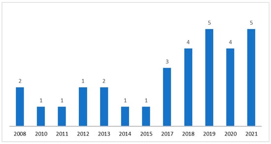 Based on the selected papers, several bibliometric characteristics were identified to understand the publication trends of performance assessment in RSCs. As depicted in Figure 2, approximately 70% of the publications (22) were published in the last 5 years, indicating a growing interest in the subject. Nonetheless, the overall volume of publications seems insufficient, given the importance of the theme. The lack of research on this topic was also reported by [,].