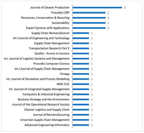 In terms of journal distribution (Figure 3), the Journal of Cleaner Production had the most papers (3), followed by Sustainability, Resources, Conservation & Recycling, CIRP Proceedings, and Expert Systems with Applications, each with two papers. Figure 3 also shows other journals, with one paper each.