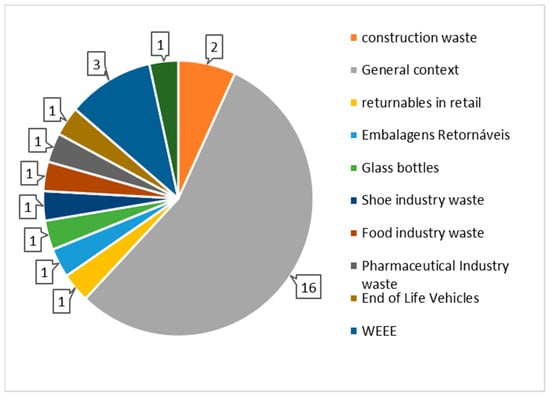 An important aspect to consider is the type of waste, as it can influence the performance assessment approach. Some papers focused on specific waste types in certain RSCs, while others had a more general approach that could be applied to any waste type (called general context). As shown in Figure 4, the majority of the studies identified (17) were related to the general context, while others focused on electric electronic equipment waste —EEEW (3)—and construction and demolition waste—CDW (2). Additionally, eight papers investigated various other waste types.