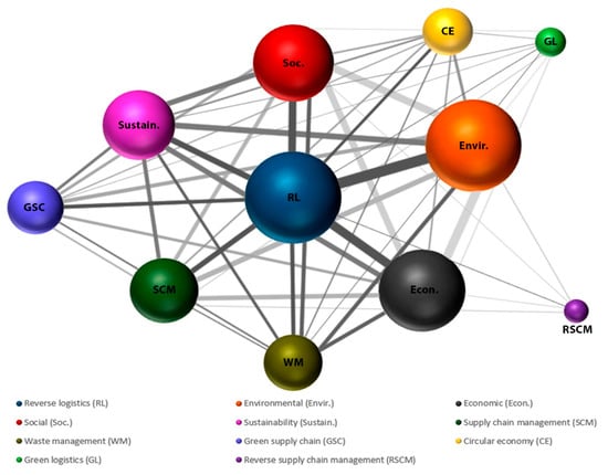 In Figure 5, RL is the main focal point with a strong occurrence relationship among the terms RL, social, environmental, and economic, followed by sustainability, WM, SCM, GSC, and CE. These findings suggest that the theoretical basis and motivation for performance assessment in RSCs are rooted in the concept of RL and the social, environmental, and economic aspects (which comprise sustainability), supported by the assumptions of WM, SCM, GSC, and CE. WM is strongly related to the objective of RL, which serves as a means for WM to achieve its own objectives. Similarly, RL emerges as an alternative to facilitate the central idea of CE. Moreover, performance assessment is an inherent aspect of SCM, which explains the consistent occurrence of this term. GSC refers to a specific way of conceptualizing a supply network based on sustainability drivers that align with the principles that underpin the use of RL as a tool. Furthermore, the surveyed papers strongly emphasize the sustainability theme, which is one of the identified perspectives for performance assessment.