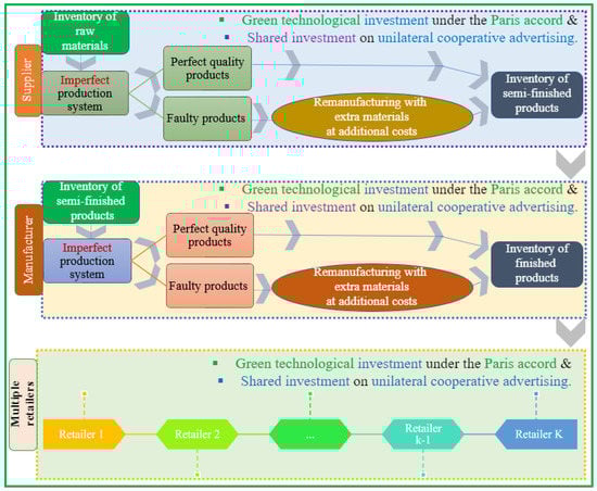 - To formulate a three-echelon SSCM model with a single supplier, a single manufacturer, and multiple retailers with the faculty machinery of the supplier and manufacturer, both subject to the unilateral cooperative advertisement policy and the solitary carbon cap-and-trade regulation of the Paris Accord for each and every chain partner in uncertain market. Moreover, to consider the instantaneous remanufacturing of defective products with supplementary raw materials by incurring additional labor- and energy-related costs to the faulty machinery of both the supplier and manufacturer of the proposed model.