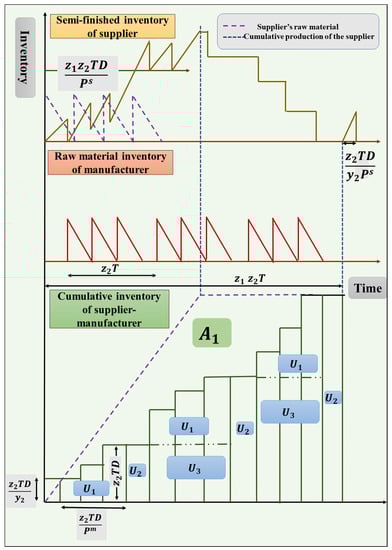 - Changes in the values of the parameter cause proportionate changes in the manufacturer’s production rate () and retailers’ cycle length (. Nevertheless, the profitability of the proposed model is modestly correlative to the changes in values of , while the supplier’s production rate () is highly sensitive to those changes. One can explore Figure 8c in this regard.