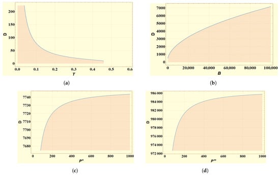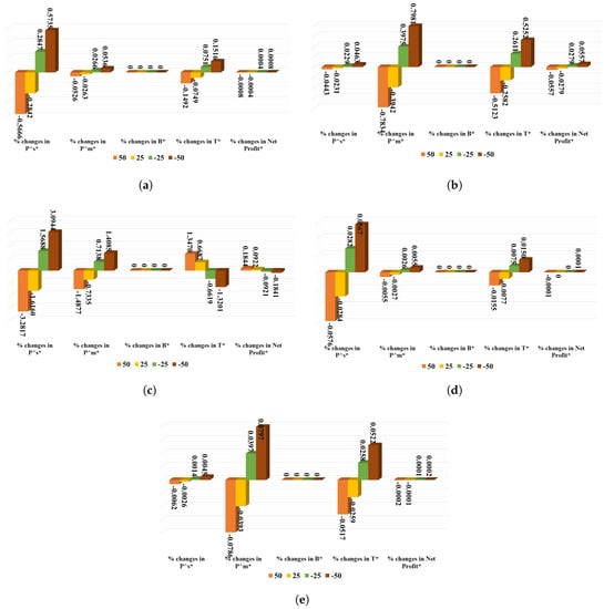 - Net profit per unit time of the proposed model is hardly changed owing to any changes in values of and . Except for the barely sensitive cycle length of retailers for the moderate changes in values of , this study finds the retailers’ cycle length to be lowly sensitive to any changes in values of both and . However, and are lowly sensitive with respect to any changes in values of and , respectively, while turning insensitive in other cases (see Figure 8d,e for details).