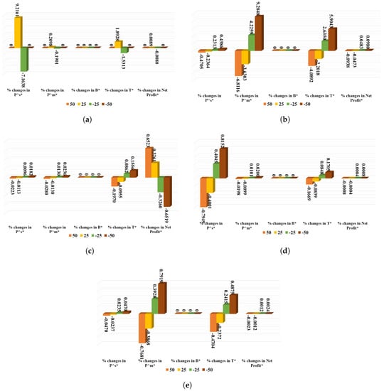 - Subject to various changes in values of (see Table 6), the current analysis finds the manufacturer’s production rate () and the retailers’ cycle length ( to be moderately sensitive, while net profit per unit time and the supplier’s production rate () are lowly sensitive. Figure 8b displays these results.