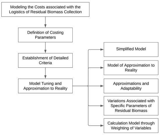 - Section 4, Modeling the Costs Associated with the Logistics of Residual Biomass Collection, is organized as presented in Figure 1. It begins with the Definition of Costing Parameters, where the various factors that contribute to the cost of logistics are identified and defined. This is followed by the Establishment of Detailed Criteria, where these parameters are further refined and categorized. The section then moves on to Model Tuning and Approximation to Reality, which is further divided into five subsections. The Simplified Model provides a basic understanding of the cost structure, while the Model of Approximation to Reality introduces more complexity and realism. The Approximations and Adaptability subsection discusses the flexibility of the model and its ability to adapt to different scenarios. The Variations Associated with Specific Parameters of Residual Biomass subsection examines how changes in the characteristics of the biomass can affect the costs. Finally, the Calculation Model through Weighting of Variables presents a method for quantifying the costs based on the defined parameters and criteria.