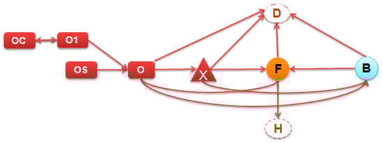 The soybean logistics network is made up of the origin set, with the soybean supply (O), the warehouse (X), the port (D), the internal market (H), the soybean meal and oil processing plant (F), and the transshipment point (B).