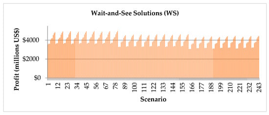 We investigated the model’s computational performance and its adherence to reality, and we performed a comparative analysis among the stochastic, WS, and deterministic solutions. Furthermore, we calculated the indicators of the gains that were achieved through the stochastic model compared with the deterministic model proposed by [].