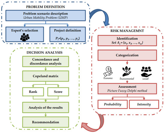 In Step 1, related to the problem definition, we characterised the urban mobility problem in addition to defining the selection of experts and the project variables. In Step 2, the risk management involved identifying the set of risks and the categorisation in terms of economic, environmental, and social dimensions of sustainability; then, we assessed the risks based on the Picture Fuzzy Delphi method, generating the probability and intensity of risks.