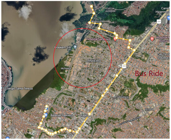 In this paper, we consider four projects related to Maceio’s urban mobility. First, as a palliative alternative (here named Project 1—P1), the LRV section between Bebedouro and Bom Parto stations, which passed through the area affected by the disaster, was deactivated. Thus, a bus route (in yellow in Figure 3) was intensified to integrate these two stations. Here, also the red circle approximately marks the area affected by the mining disaster.