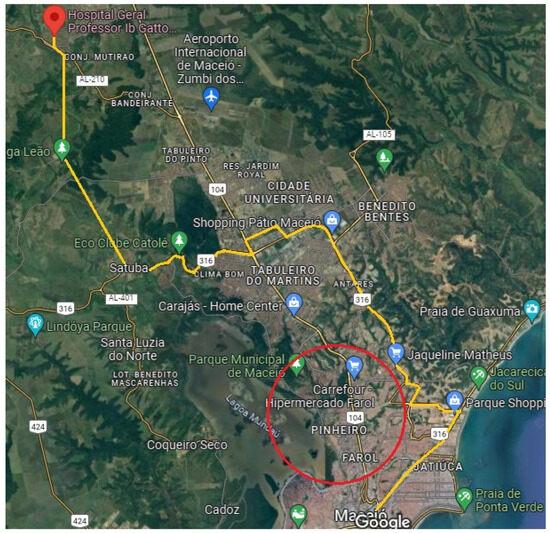 Among the multiple negative impacts of this man-made disaster, we can highlight the urban mobility problem due to the isolation of the affected area. Thus, 10 bus lines and a section where the LRV passed through were deactivated. The original LRV route, i.e., before the disaster, can be seen in Figure 2 (path in blue). The red circle approximately marks the area affected by the mining disaster.