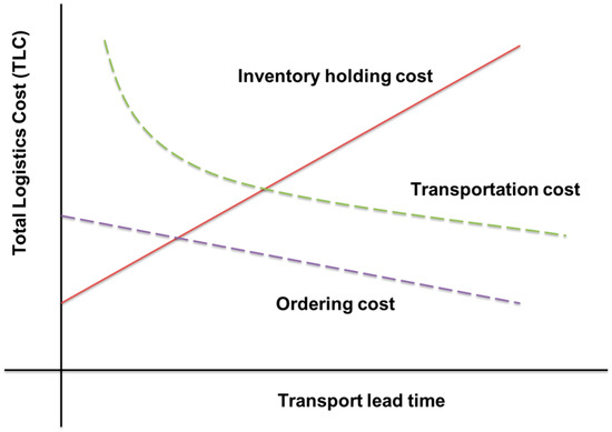 Selecting the mode of shipment for transporting goods is one of the most crucial business decisions affecting an organization’s finances. As the transport lead time increases, inventory holding costs rise to a significantly higher value, but as more goods are carried at a time, Overall transportation costs reduce. When lead times are higher, there is an increase in order quantities. Hence, fewer orders are placed, reducing overall ordering costs, as shown in Figure 1. It illustrates TLC against transport lead time adopted from literature explaining planning, organizing, and controlling of business logistics/supply chain management by Ballou and Srivastava [25]. This interdependence has to be carefully understood, and TLC should be minimized. The below graph can easily be obtained by the relation in Equation (9), discussed in a later portion of this paper.