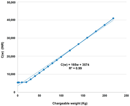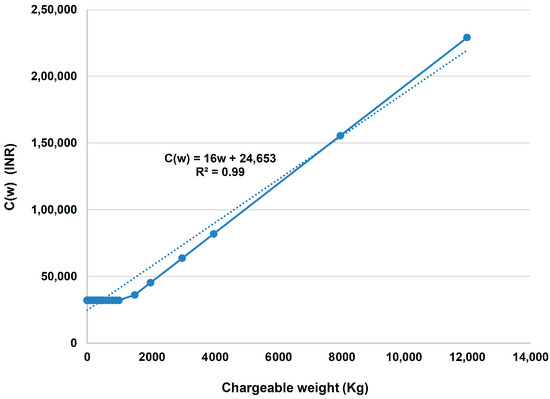 The transportation cost function C(w) is dependent on variable w (chargeable weight). A transportation cost for import shipments by air from Germany to India is discussed. Figure 3 shows the variation in transportation cost by air transport for different values of chargeable weight. The curve is represented as a linear function for transportation cost (C(w)) per shipment. This will help us generalize the function and define the overall optimization problem more clearly, as discussed further: